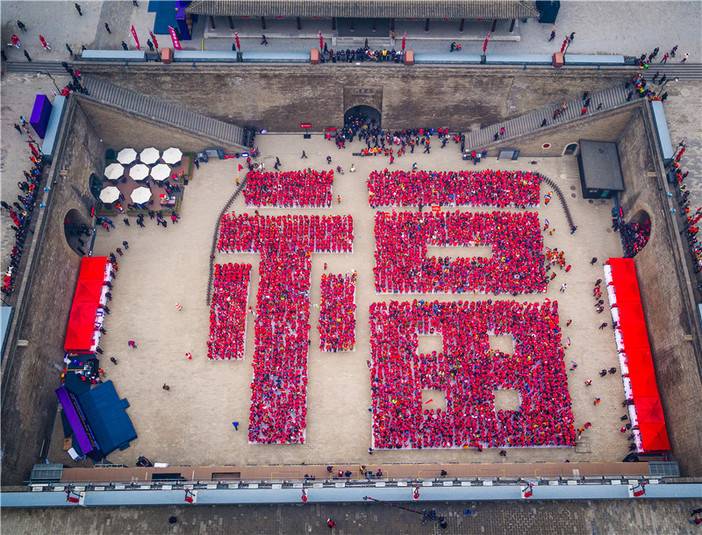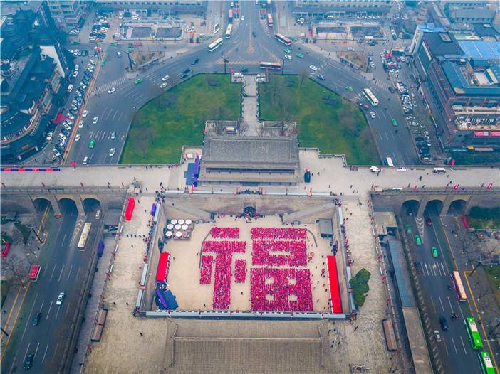 2017年1月1日,一年一度的西安城墙迎新年祈福长跑在西安城墙南门段激情开跑,参加西安城墙迎新年祈福长跑的数千名跑者在南门瓮城摆出一个巨大的“福”字,传递“共享世界,共筑幸福”的美好新年祝愿。市民们通过跑步的方式祈福新年、共筑幸福。(陕西传媒网)