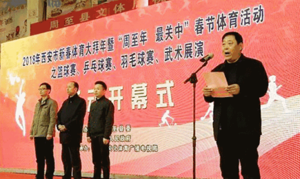 2月23日,2018年西安市新春体育大拜年暨“周至年 最关中”春节体育活动之篮球赛、乒乓球赛、羽毛球赛及武术展演活动开幕式在周至县文体中心举行。来自全县的45支代表队,300余人参加开幕式。活动旨在让城乡群众在春节期间感受体育之美,主动参与其中,在全县形成热爱体育,崇尚健身的良好氛围。