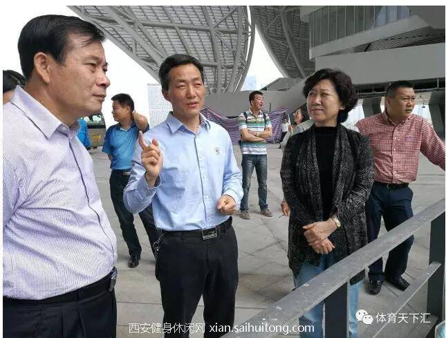 西安市体育局局长冯艳阳(前排右)听取杭州奥体博览城情况介绍