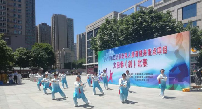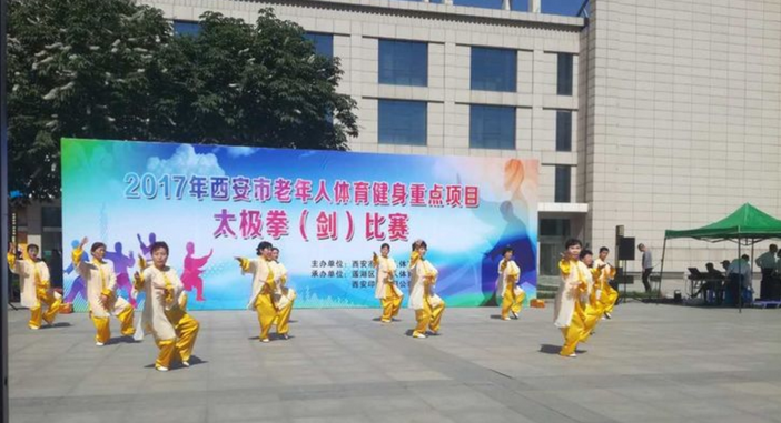 由西安市老年人体育协会主办、莲湖区文体局、莲湖区老年人体育协会和西安印钞有限公司共同承办的2017年西安市老年人体育健身重点项目太极拳(剑)比赛5月12日在西钞文化广场隆重举行,来自24支代表队的近400名队员参加了本次比赛。