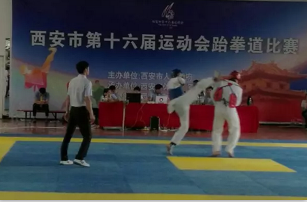 西安市第十六届运动会(青少年组)跆拳道比赛于5月21日在市体育运动学校跆拳道训练馆降下帷幕,本次比赛共有来自全市的13个区县代表队275名运动员参加,经过一百六十多场的激烈角逐,碑林区代表队以9金、8银、3铜的成绩获得男子团体总分第一名。