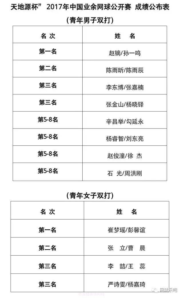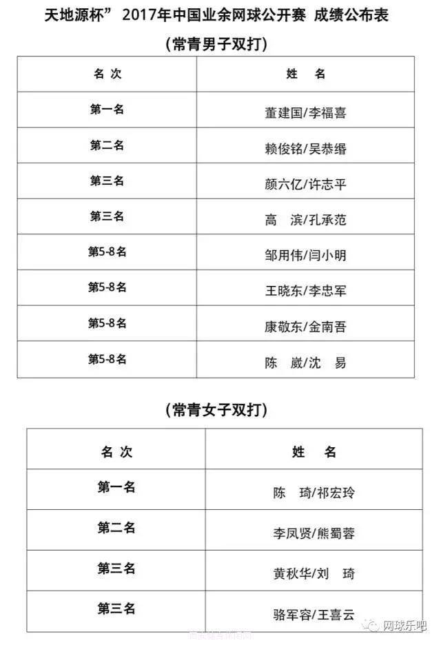 “天地源杯”2017中国业余网球公开赛(CTA-open)西安白金赛成绩公布