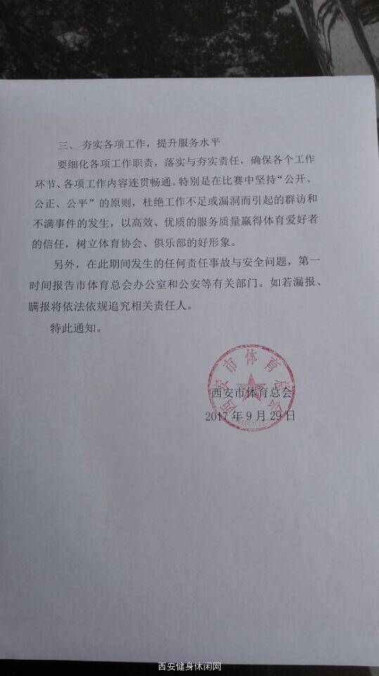 凡是在此时间段举行的体育赛事与活动,要从讲政治的高度重视安全和维稳。社团的主要负责人与法人切实担负起各自的职责和责任,确保所承接、承办的体育赛事与活动安全顺利的举行,为“节日”添彩,为党的“十九大”胜利召开献礼。