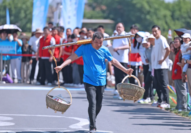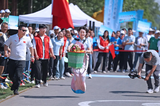 随后的比赛中,位于秦岭终南山下的蔡家坡村和八号公路沿线成了欢乐的海洋,加油呐喊声此起彼伏。运转水果、硕果累累、剥玉米、担粮食、独轮运粮、龟兔赛跑、回娘家、田间大力士,所有项目的设置都特别接地气。运转水果项目其实是参赛选手穿上袋鼠跳服装,将各类水果装满背包,然后满载水果行囊跳跃至终点,最先抵达的便是优胜者。