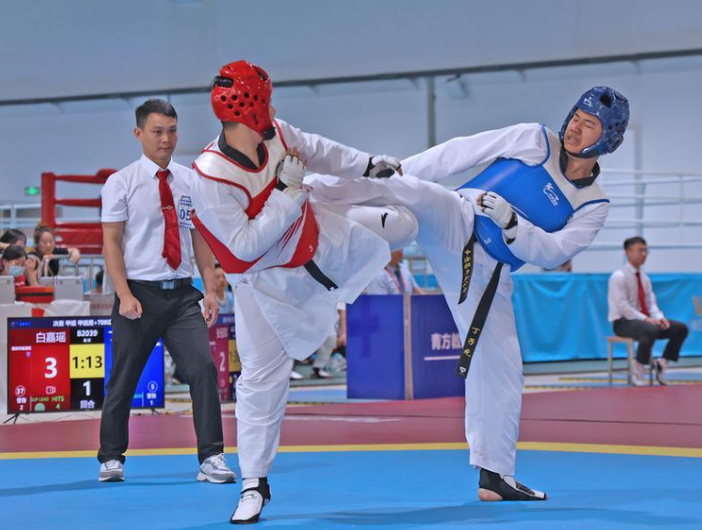 本次比赛按照参赛选手年龄设男女甲、乙、丙三个组别,涵盖了西安市12岁至17岁的青少年跆拳道选手同台竞技、共展风采。西安市体育运动学校校长、本次比赛竞赛委员会副主任李凯表示,为办好本次比赛,大家做了大量的组织和筹备工作,从竞赛编排到设备检验,再到细化裁判工作流程,每项具体工作都安排了专业团队负责。就拿比赛装备来说,这次比赛采用电子计时、计分系统,运动员身上穿着的护甲和护头都装有传感器,在比赛对抗过程中,一旦击中对方的头部、躯干等有效部位便可得分,最大程度地保证了比赛的公平和公正。