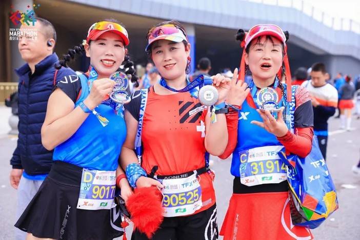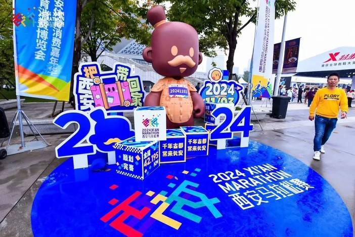 西安马拉松赛期间,还首次举办了2024西安体育消费嘉年华暨西安体育消费博览会,吸引了包括体育用品、体育装备、体育科技、体育文创等近百家企业参展,完赛后,琳琅满目、独具陕西特色的体育周边产品激发了参赛选手的体育消费热情,提升了赛事的经济效应。这场体育盛会,也使西安马拉松在促进文旅体商深度融合发展方面起到了更大促进作用。