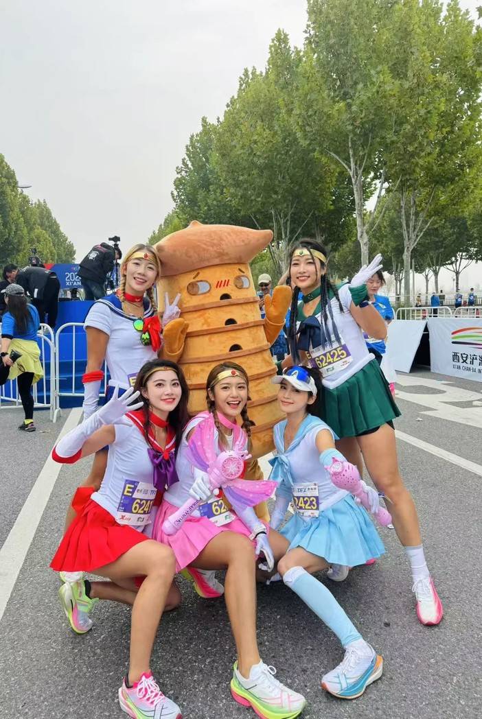 来自广东的真子今年第二次跑西马,真子表示:“虽然来得晚,但在展会上也感受到了西马满满的热情,来之前就看到很多跑友分享了文创周边,真的太喜欢了。不得不说设计师很在线。今天的奔跑,温度湿度都很不错,不少路段的市民朋友、学生志愿者都很热情,第一次COSPLAY的我们也很开心,一路上有不少跑友和我们合照,以一种新的形式奔跑在千年古都,在七周年之际感受西马的无限魅力,是我期待中的西马。”