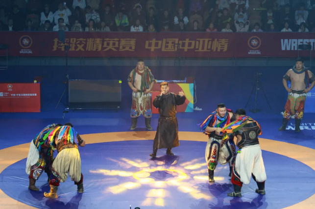 比赛开幕式文体表演以摔跤文化为主题,通过摔跤操、蒙古跤、中国跤等表演形式,展现了摔跤运动的悠久历史和独特魅力。最后,中英文男女对唱演绎的主题曲《壮志跤行》将现场气氛推向高潮,激昂的旋律和深情的歌词传递了运动员们勇于拼搏、追求卓越的精神风貌。