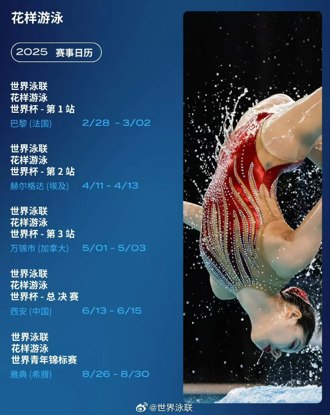 据了解,2025世界泳联花样游泳世界杯包括三站分站赛以及最后的总决赛,前三站比赛分别在法国巴黎(2月)、埃及赫尔格达(4月)、加拿大万锦市(5月)举行,总决赛则在西安打响。