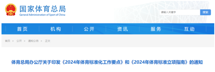 为做好2024年体育标准化工作,体育总局制定了《2024年体育标准化工作要点》和《2024年体育标准立项指南》,现印发给你们,请结合工作实际认真贯彻落实。