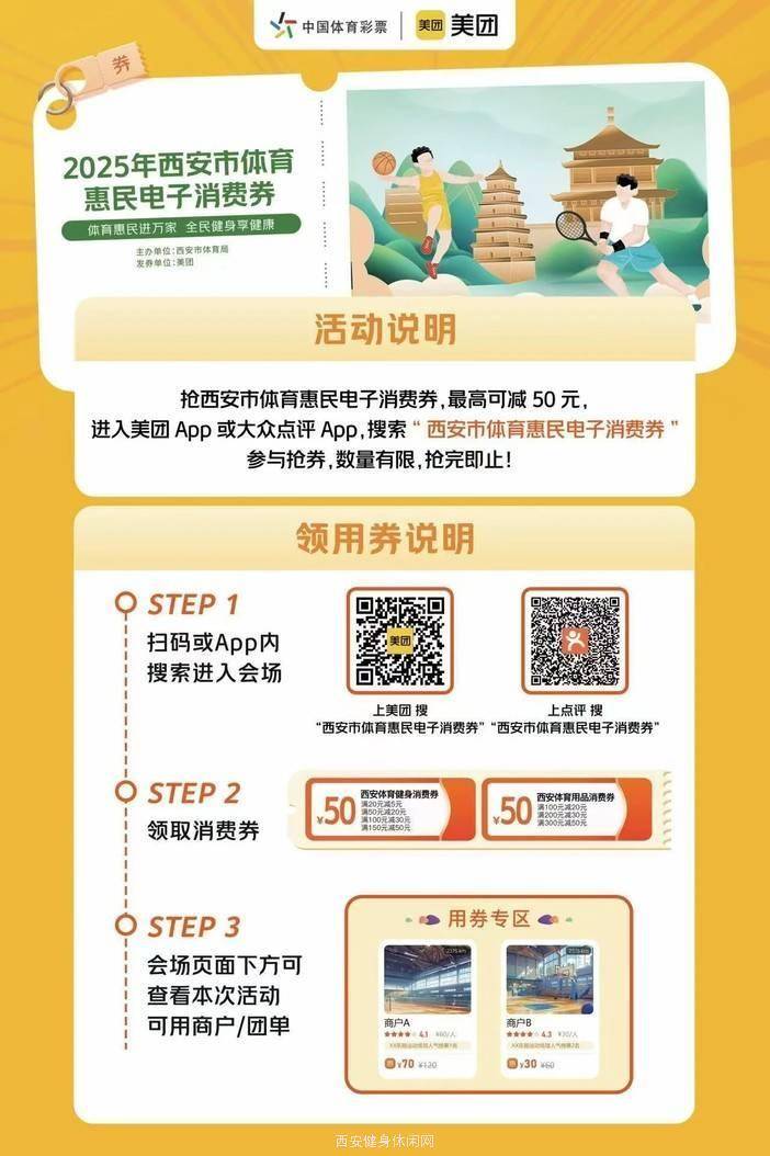 体育惠民进万家,全民健身享健康。在第17个“全民健身日”来临之际,为助力全民健身活动广泛开展,满足广大人民群众日益增长的健身需求,2025年西安市体育惠民电子消费券将在8月8日“全民健身日”当天集中发放50万元体育健身类消费券,同时在8月8日以及8月29日七夕节上午10点,分别发放20万体育用品类消费券。 据了解,今年西安市体育局共安排500万元市级体育彩票公益金支持体育惠民电子消费券发放活动,券种包括体育雪场类消费券、体育健身类消费券以及体育用品类消费券,参与体育消费券发放活动的体育健身场馆超过600家,大型单体体育用品综合零售店15家。