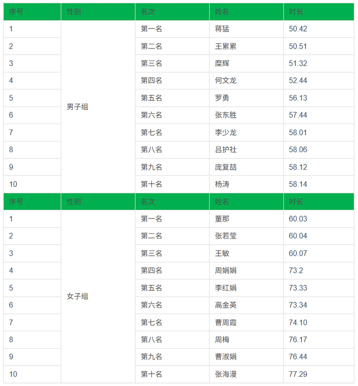 经过激烈角逐,男子组:蒋猛以50分42秒的成绩率先撞线,夺得男子冠军,王累累以50分51秒的成绩获得亚军,糜辉以51分32秒的成绩获得季军。女子组:董那以60分03秒的成绩获得女子冠军,张若莹以60分04秒的成绩获得亚军和王敏以60分07秒的成绩获得的季军。