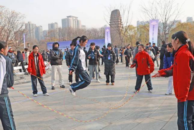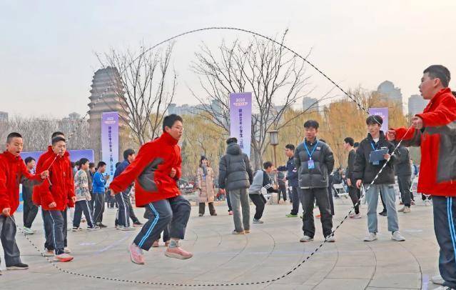 冬日的小雁塔景区,千年古塔更显巍峨,遒劲的松柏依旧挺拔,与赛场上传来的阵阵呐喊交织出独特的冬日竞技图景。运动会设置小学甲组、小学乙组及中学组三个组别,设有单摇跳、双摇跳、正反挽花等跳绳项目,单踢、五花样毽等踢毽项目,以及双绳外抡、三分钟“8”字竞速等集体项目,既考验个人技能,又注重团队协作。
